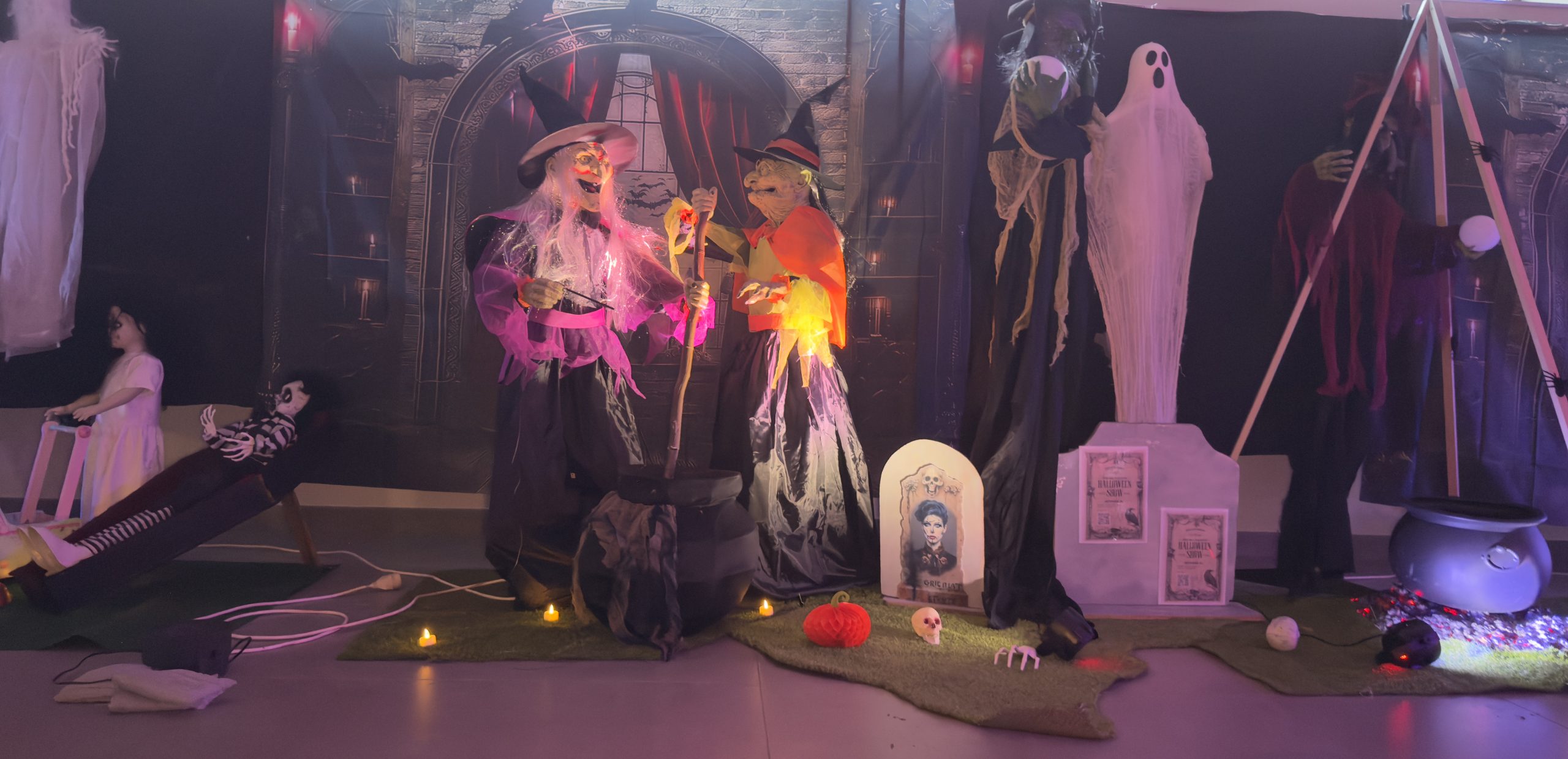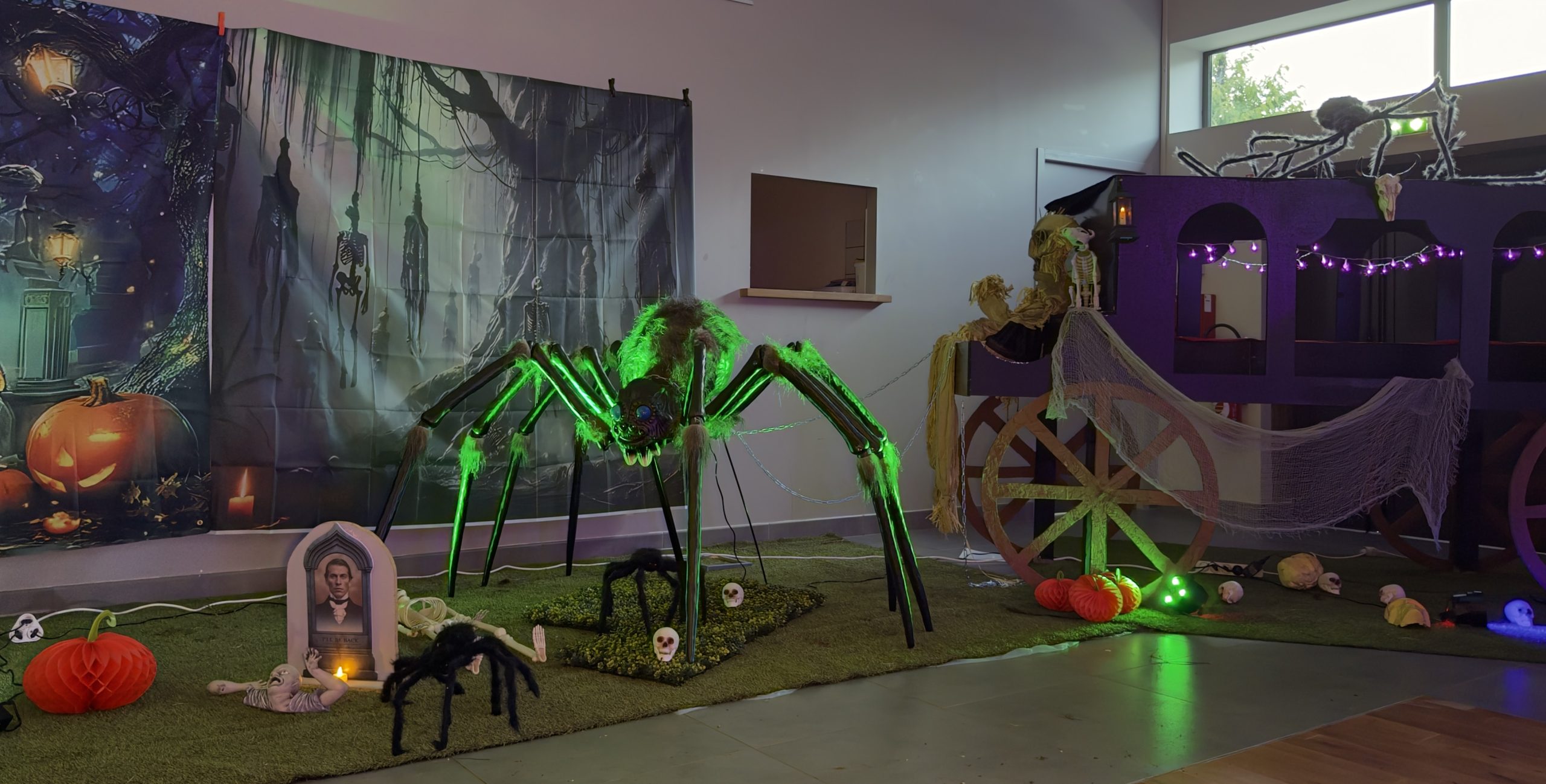 🎃 Décor Halloween complet : toiles d’araignée, citrouilles, squelettes, cercueils, fantômes, effets lumineux et brume artificielle.
